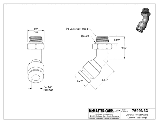 45 Degree Elbow Adapter, 1/4" Tube OD x 1/8 Pipe Size