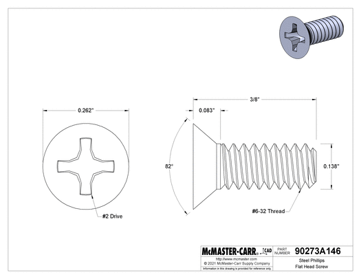 82 Degree Countersink Angle, 6-32 Thread Size, 3/8" Long